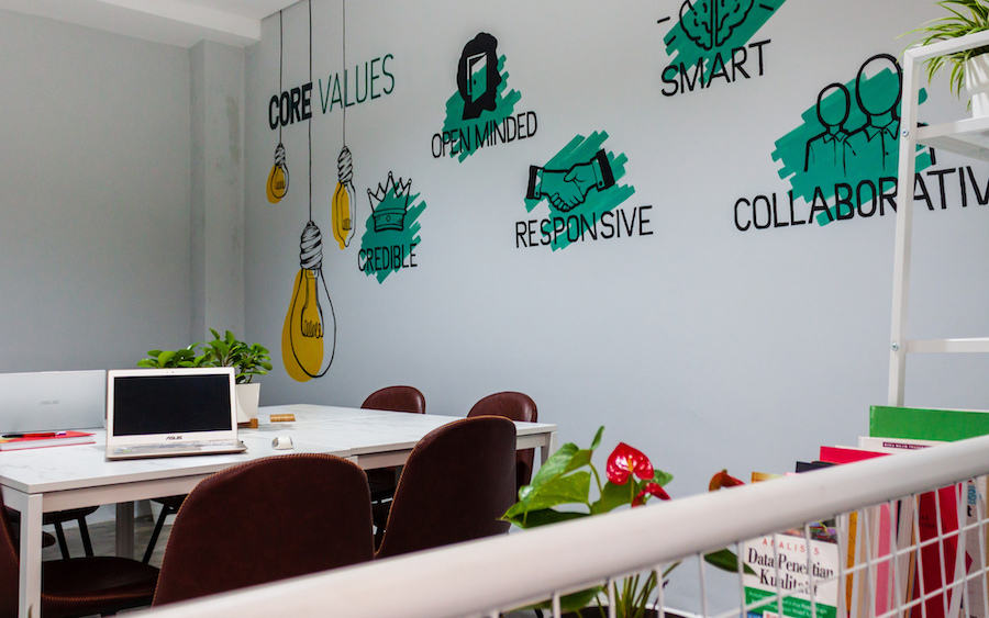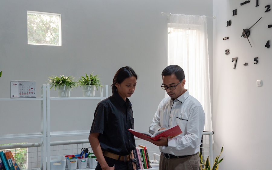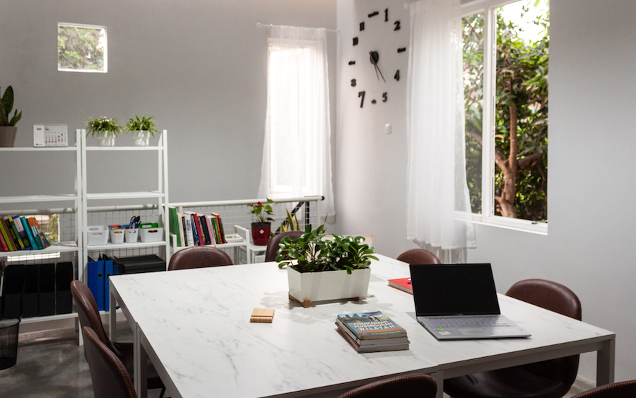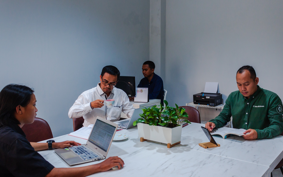 This office building was designed with a balance between functionality and comfort. The front area features an open space with a large tree that provides natural shelter, creating a cool and relaxing atmosphere. Inside, each space is neatly organized to support work efficiency, with natural lighting from glass windows as well as additional warmlight that gives a warm and professional impression. Flexibility is an advantage, allowing meeting activities to take place both in the cozy indoors and in the natural outdoor area.