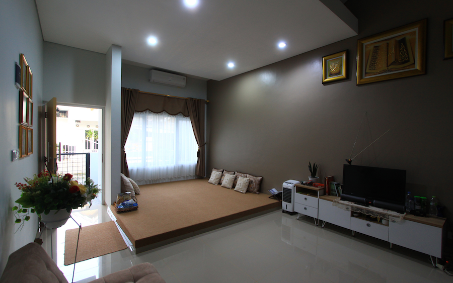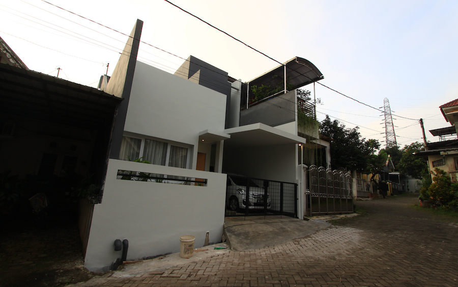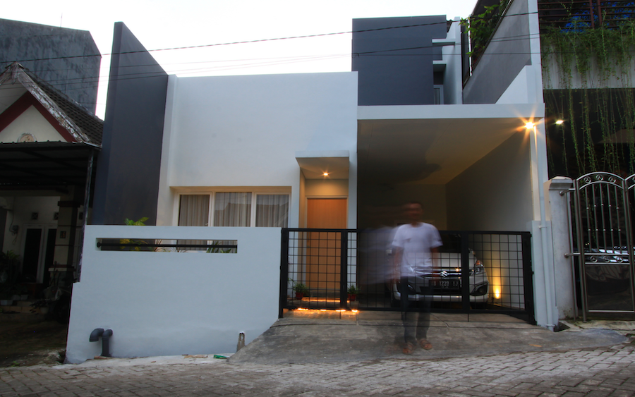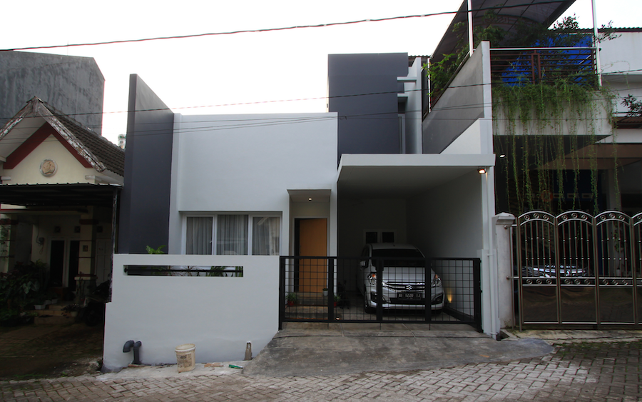 This house looks modern with a combination of white and gray colors that give an elegant and firm impression. The play of volumes and lines makes the look more dynamic, while the simple carport canopy blends well with the overall design. The minimalist iron fence keeps security in place without blocking the view, while the large windows in the front area ensure optimal natural light. A touch of green from the small garden in front of the house adds balance, bringing a fresher and more alive feel.