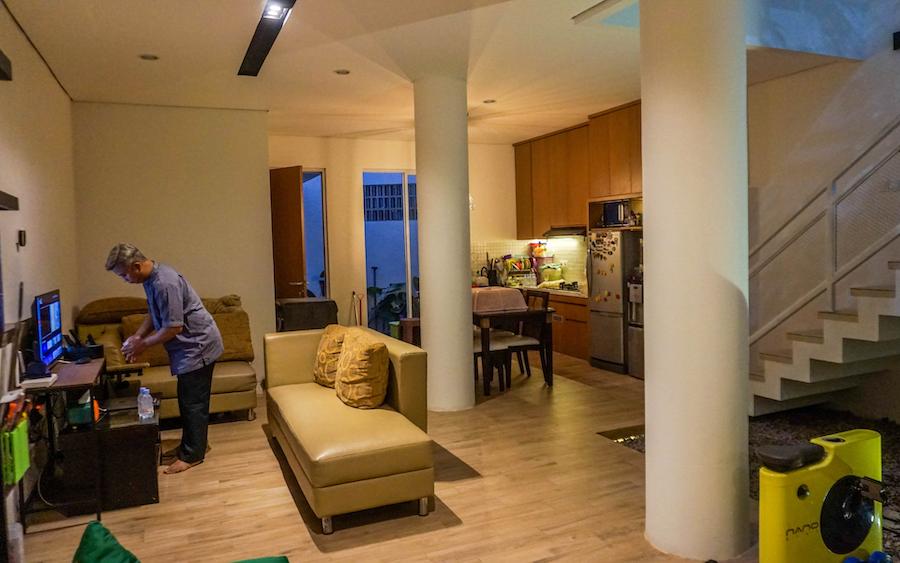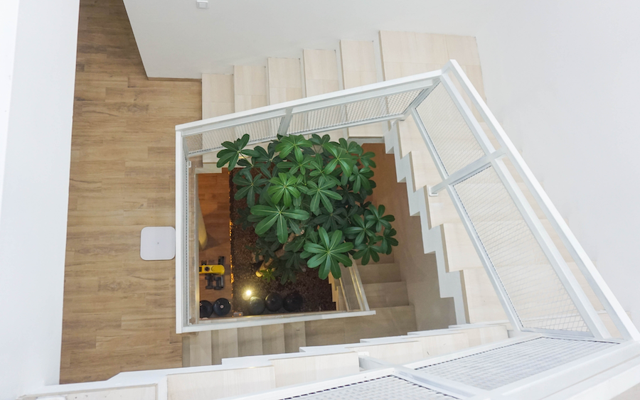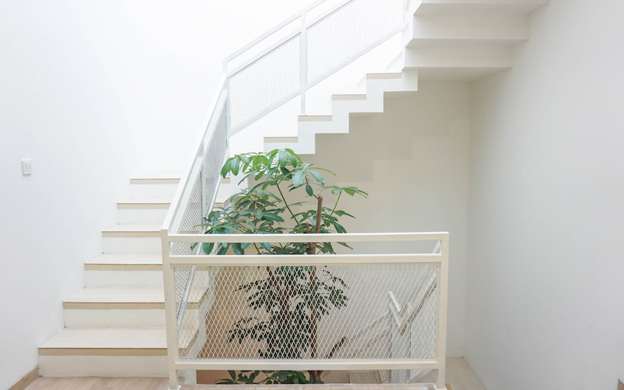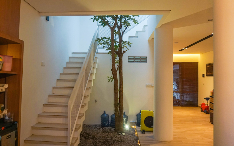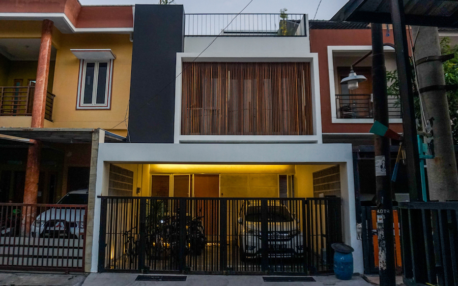This house carries a modern minimalist design with natural lighting, optimal ventilation, and elegant materials. The facade combines with wooden lattices for privacy, while the rooftop with concrete roster supports air circulation. Void with an inner garden adds coolness, while the metal and wood accented stairs strengthen the modern impression. The spacious carport ensures comfort, creating a practical residence that is in harmony with nature.